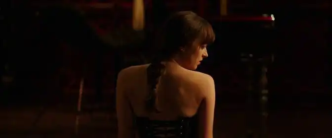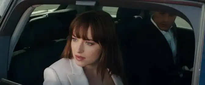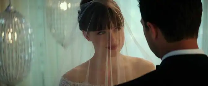 Визуальные отсылки в картине выстроены через повторяющиеся цветовые акценты и мотивы. Серый как доминанта в оформлении интерьеров и в гардеробе героя присутствует с самого названия и повторяется в кадре как напоминание о личности Кристиана, его контроле и внутренней структуре. Контрастный красный цвет традиционно ассоциируется с «комнатой скорби» и теми гранями сексуальности, которые проходят через всю трилогию; в Пятьдесят оттенков свободы этот цвет выступает и как метафора опасности, и как символ страсти, и как визуальная нить, связывающая фильм с предыдущими частями. Белый свадебный наряд Анастейши и темные костюмы Кристиана отсылают к классическому противопоставлению невинности и власти, но в кадре эти цвета также подчеркивают переход героев к новой фазе отношений, где противоположности пытаются найти баланс.